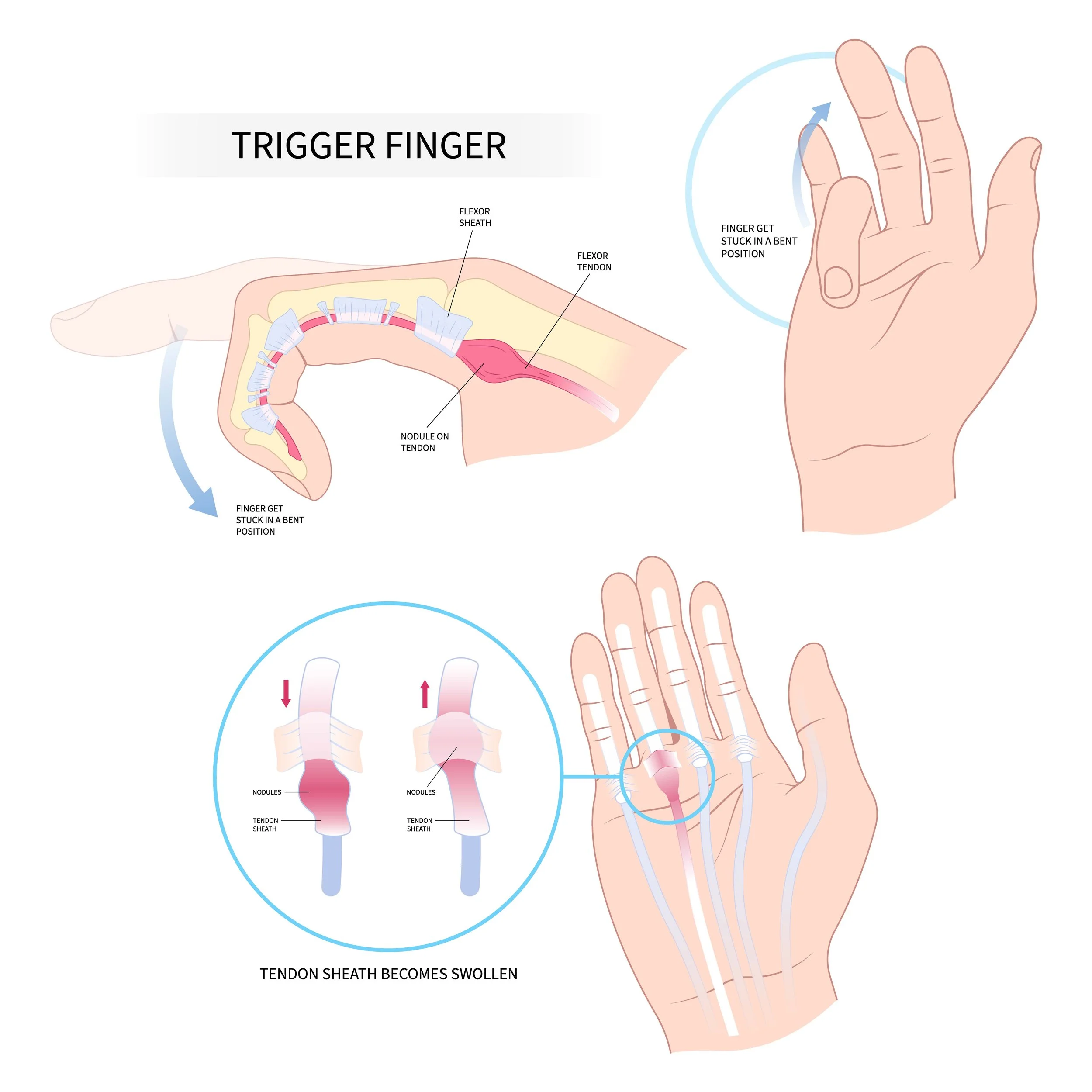 Trigger finger occurs when the tendon sheath that surrounds the tendon gets inflamed, making it harder for the tendon to glide through the tendon pulleys which form a ‘tunnel’ as the digit bends. Over time, the tendon may also become inflamed and develop a small nodule on the surface, further aggravating the condition. When the digit bends or straightens, the nodule must pass through the sheath ‘tunnel’, which causes a sensation of catching or popping.